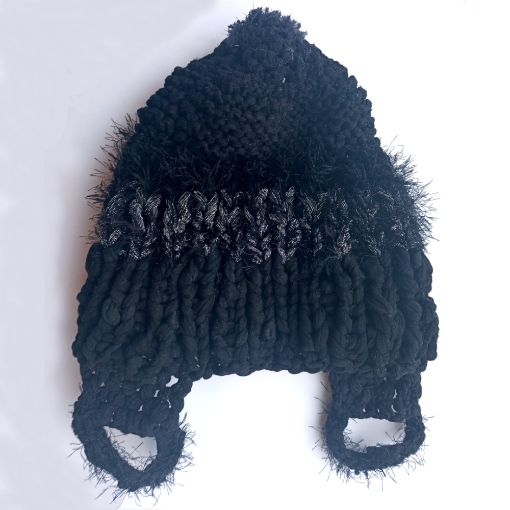 Black beanie chunky knitted and crocheted. Materials polyester, Lycra and fake fur. With a silver trim. Height 26 cm. Circumference 59 cm. With two handles at the ears, you can also use this hat as a bag.