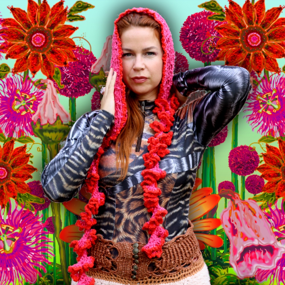 Een lange sjaal met capuchon en ruches. Gemaakt in een ajour haakpatroon. Van een hoogwaardige kwaliteit fluweel bouclégaren viscose/katoen in fel donkerroze met rode details. Lengte sjaal: 140 cm, breedte: 5 cm. De sjaal met capuchon is plat gemeten: hoogte: 37 cm en breedte: 30 cm. Fair trade product gemaakt in NL.